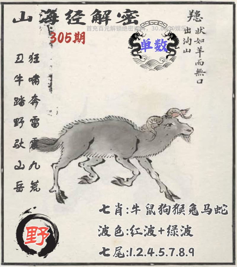 | 301期九肖 | 龙猴牛虎鼠蛇狗鸡马 | 開:牛05 |